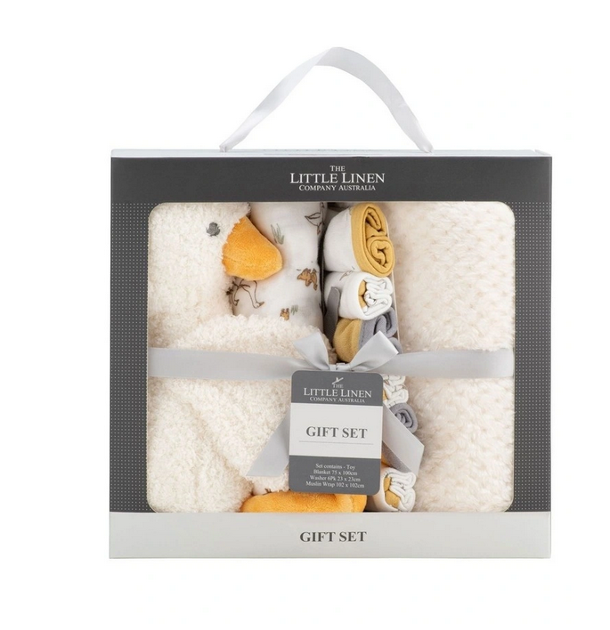 This Little Linen Boxed Gift Set combines key items to have on hand for any newborn bub.