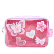 Butterflies, flowers, and hearts- oh my! This glittery clear tinted pouch is a beauty essential! Detailed with butterfly, hearts, and flower patches and a mini side strap so you can clip it to your bag!
