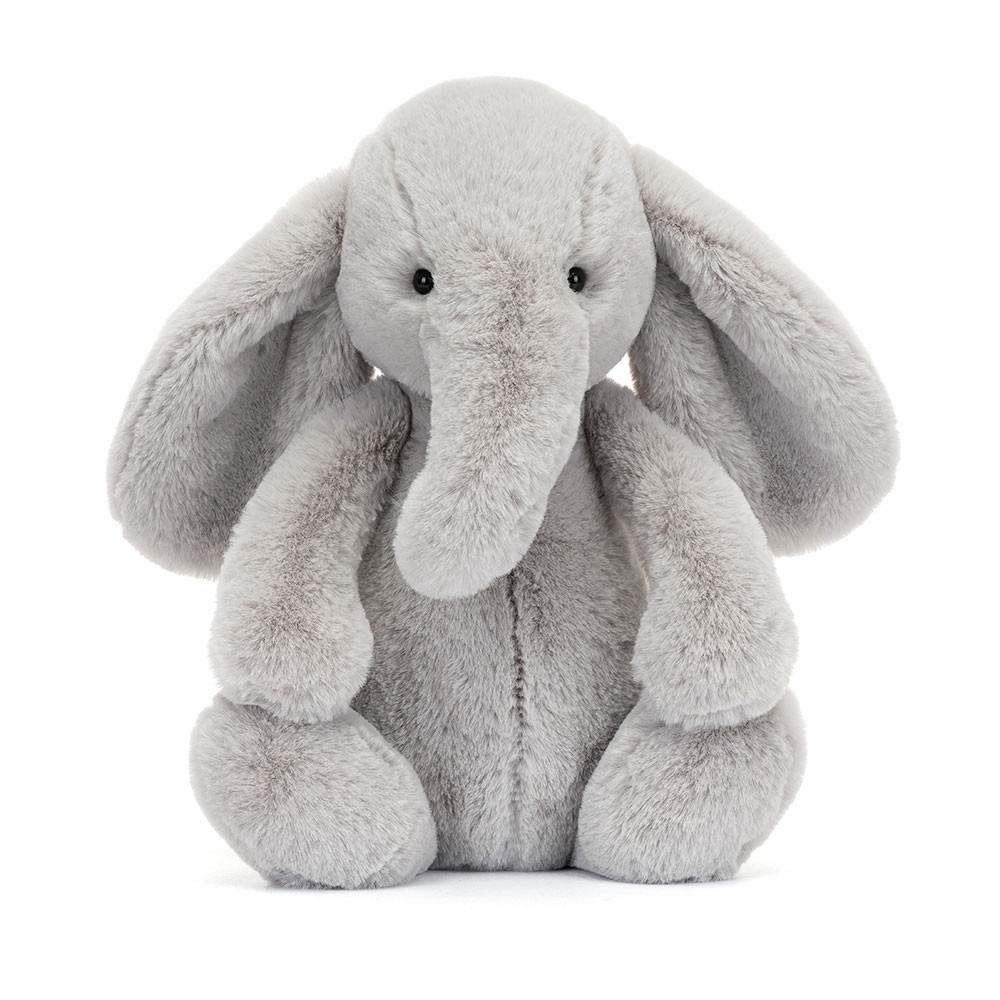 Bashful Luxe Elephant Thuddeus has a nose for adventure. In luxuriously soft grey fur with a fluffy tail tip, Thuddeus uses that long, curved trunk to sniff out new friends, and those big ears to listen to exciting stories. What adventures will you seek out together?