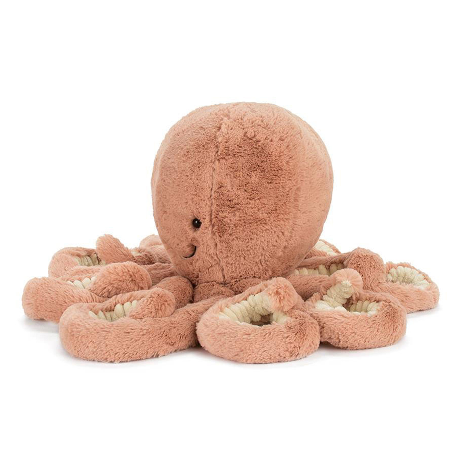 Get tangled up with gorgeous Odell Octopus! A squishy, splendid brick-red octopus, she has so much love to give! Smiley and silly, with bright, glossy eyes, she's a very friendly cephalopod. Odell has eight fine, curly arms with cosy cordy and classic fur. No surprise that she gives the best hugs in the ocean!