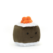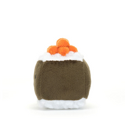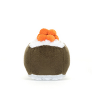 Sassy Sushi Hosomaki is squat, neat and super-cute. This cheery roll has fluffy white rice and a dark green nori wrap – all set off with a fetching hat of bobbly orange roe. Chopsticks at the ready!