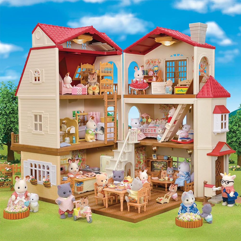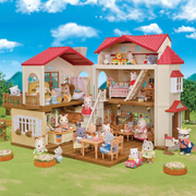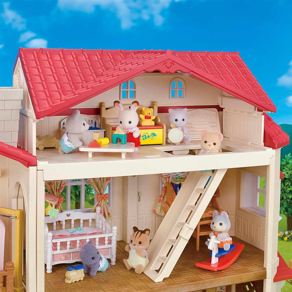 Red Roof Country Home (Secret Attic Playroom) features a large house that's highly customisable for play! The second floor room on the left side, and the roof on the right side, are removable. Placing this room on top of the roof, or placing the roof on top of the terrace creates a large, three-storey house to play with. The attic room can be used as a secret play space for the babies ... watch the ladder spring out of its hiding place!