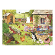 Step into Grandma's Garden, a heartwarming Big 500-piece jigsaw puzzle illustrated by the talented Tracy Hall. This delightful scene captures a peaceful moment in the garden, where a lady tends to her flowers while curious chicks peck at the ground nearby. It's a joyful celebration of nature, nurture, and the simple pleasures of a sunny day outdoors.