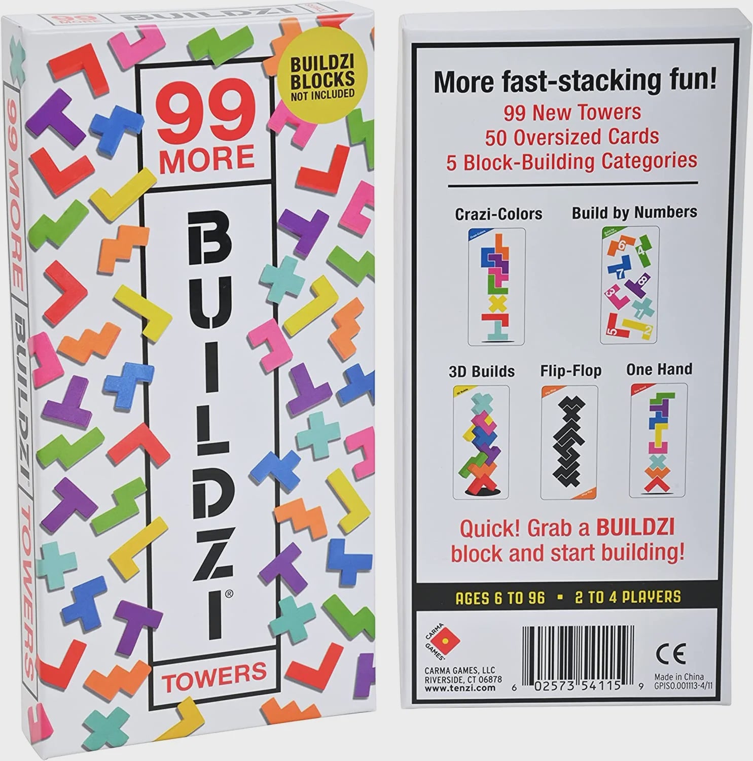 99 More BUILDZI Towers includes five new types of tower cards, Crazy Colours, Build by Numbers, 3D Builds, Flip Flop, One Hand and many MORE towers to build!