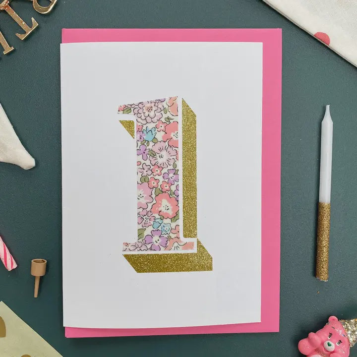 Celebrate those special childhood birthdays in style with this gorgeous, eco-friendly card! A6 size - 14.8 cm x 10.5 cm Left Blank inside for your own message Made in the UK using Liberty fabrics and biodegradable glitter.