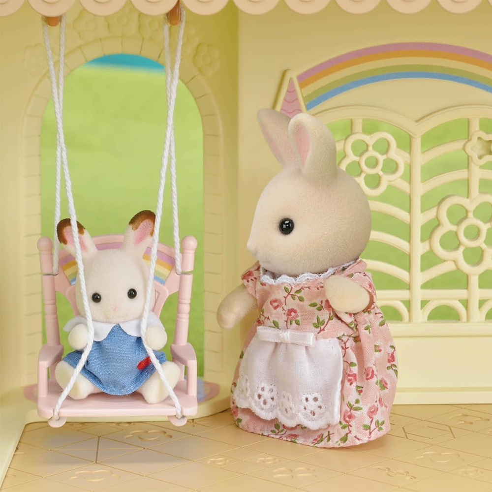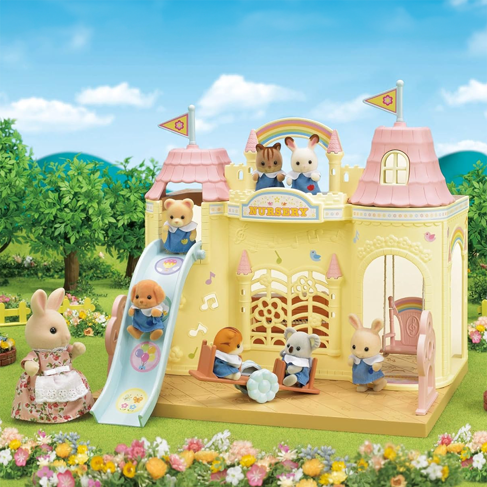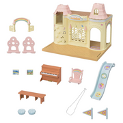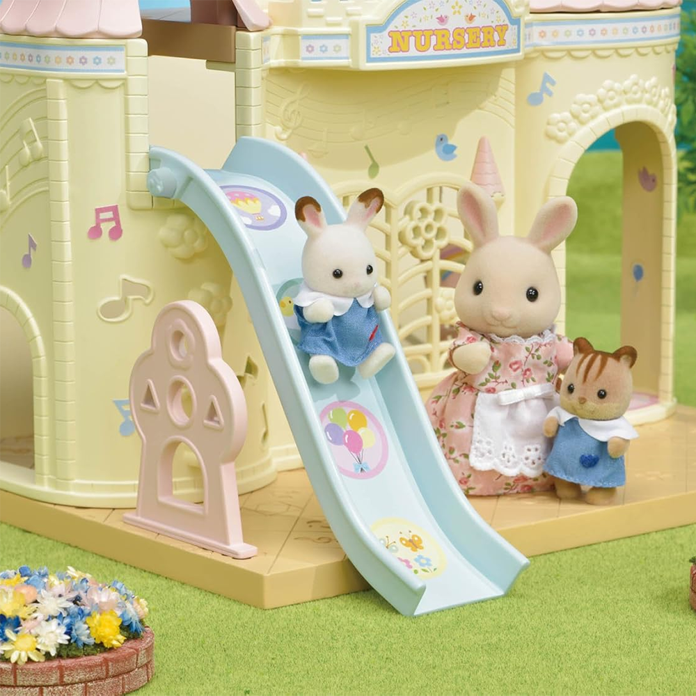 This adorable nursery school has been designed in the shape of a castle and features colourful decorations and playground equipment! A slide, swing and seesaw attach to the nursery for all the baby Sylvanians to enjoy. The reversible floor panel can be adjusted to change the internal/external floor space of the building for creative imaginary play sessions.