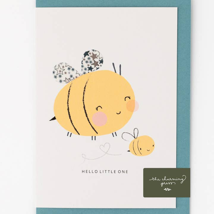 Hello Little One! A beautiful little bee with Liberty wings in these gorgeous prints. Blank inside for your own message - 'Hello Little One' on the front dimensions: Card A6 portrait - 14.8 x 10.5 cm