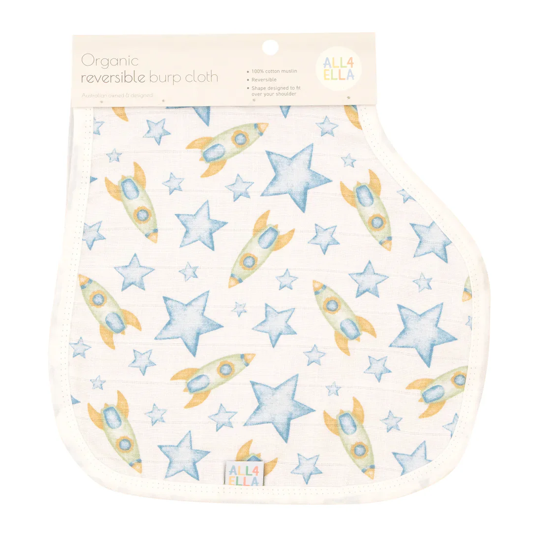 Made with 100% cotton muslin, the specific shape of the All4Ella burp cloth is designed to keep you and your little one clean. The generously sized, absorbent fabric draped over your shoulder will catch all of that dribble.
