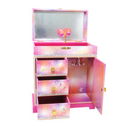 Butterfly Skies Luxury Musical Jewellery Storage Box with Spinning Butterfly is a large Butterfly-themed music box that is a practical gift with plenty of room to store her whole jewellery collection. It features a large top compartment with flocked lining to protect precious metals, three drawers for separating trinkets, and a rotating hook chandelier for hanging multiple bracelets & small necklaces. Wind up for the inner butterfly to rotate to the tune Dance of the Sugar Plum Fairy. It also contains a full-size mirror.