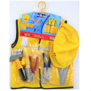 Set includes Safety Vest, cap, fabric tool belt, hammer, wrench, pliers, saw, screwdriver. Good quality fabric and finish