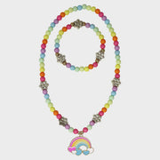 Pink Poppy's Daisy Rainbow Necklace and Bracelet Set. This colourful daisy rainbow bracelet is the perfect daily accessory. Bright coloured beads with shiny gold metallic daisy beads adorned with a cute metal rainbow charm.