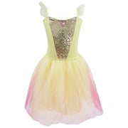 Disney Princess Belle Romantic Dress Inspired from ©Disney Princess. This Belle tutu dress with a long-style skirt is suitable for all occasions. The ombre coloured mesh with sparkling glitter flows over a layer of stiff tulle for volume and silky satin lining soft against her legs. The comfortable stretch jersey bodice has a sparkling sequin central panel and character-printed heart gemstone. Integrated leotard pants make climbing and handstands all still possible in this everyday dress. The shoulder ruffles shimmer with glitter on adjustable shoulder straps making the fit perfect.