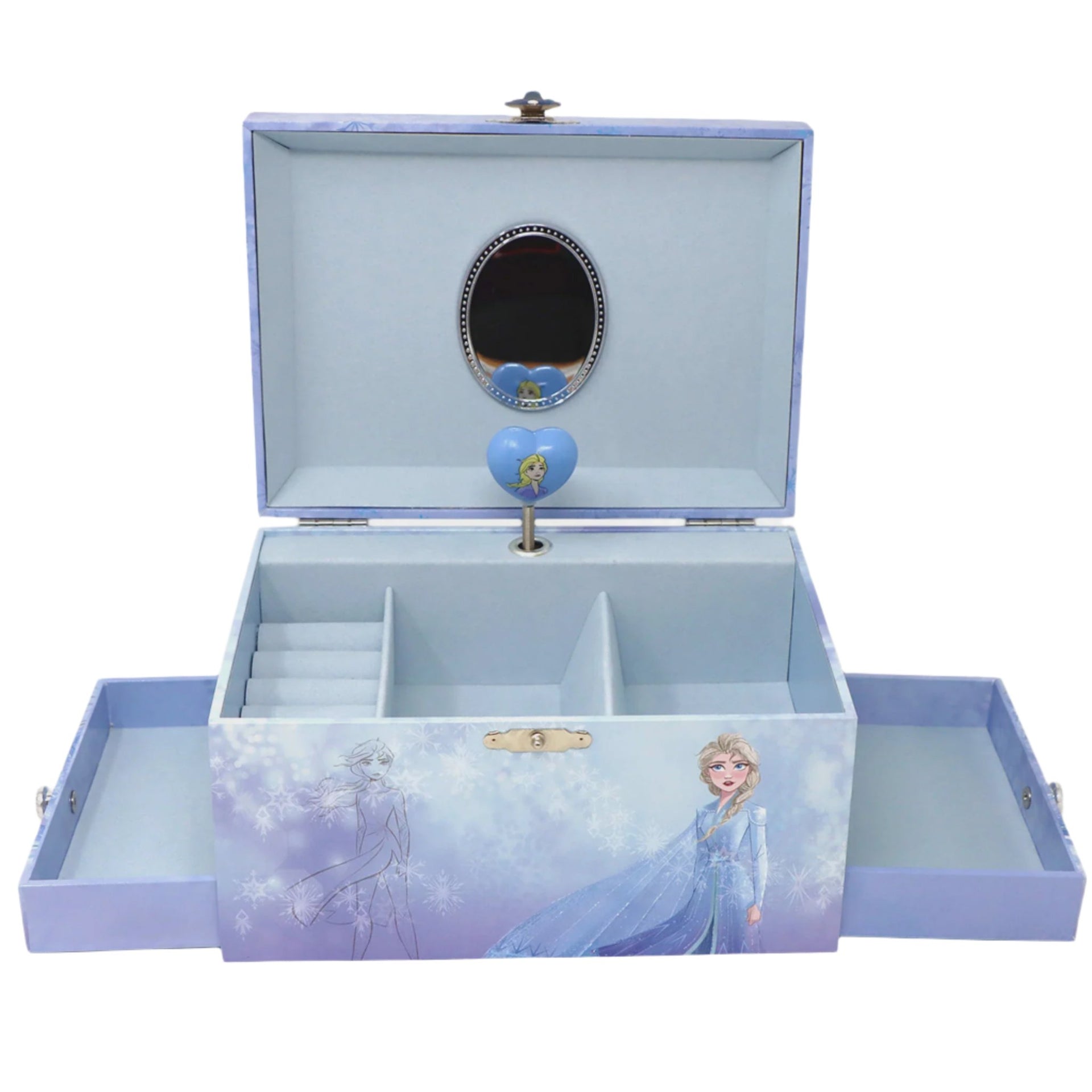 A flocked lining protects your precious jewellery. Perfect for keeping your treasures safe! It has 2 side draws, a ring compartment, a divided jewellery compartment, a mirror & a rotating printed heart figure with Elsa print that spins to the tune of Waltz of The Flowers.