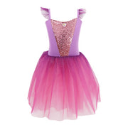 Disney Princess Rapunzel Romantic Tutu Dress Inspired from ©Disney Princess. This Rapunzel tutu dress with a long style skirt is suitable for all occasions. The ombre coloured mesh with sparkling glitter flows over a layer of stiff tulle for volume and silky satin lining soft against her legs. The comfortable stretch jersey bodice has a sparkling sequin central panel and character printed heart gemstone. Integrated leotard pants make climbing and handstands all still possible in this everyday dress. The shoulder ruffles shimmer with glitter on adjustable shoulder straps making the fit perfect.
