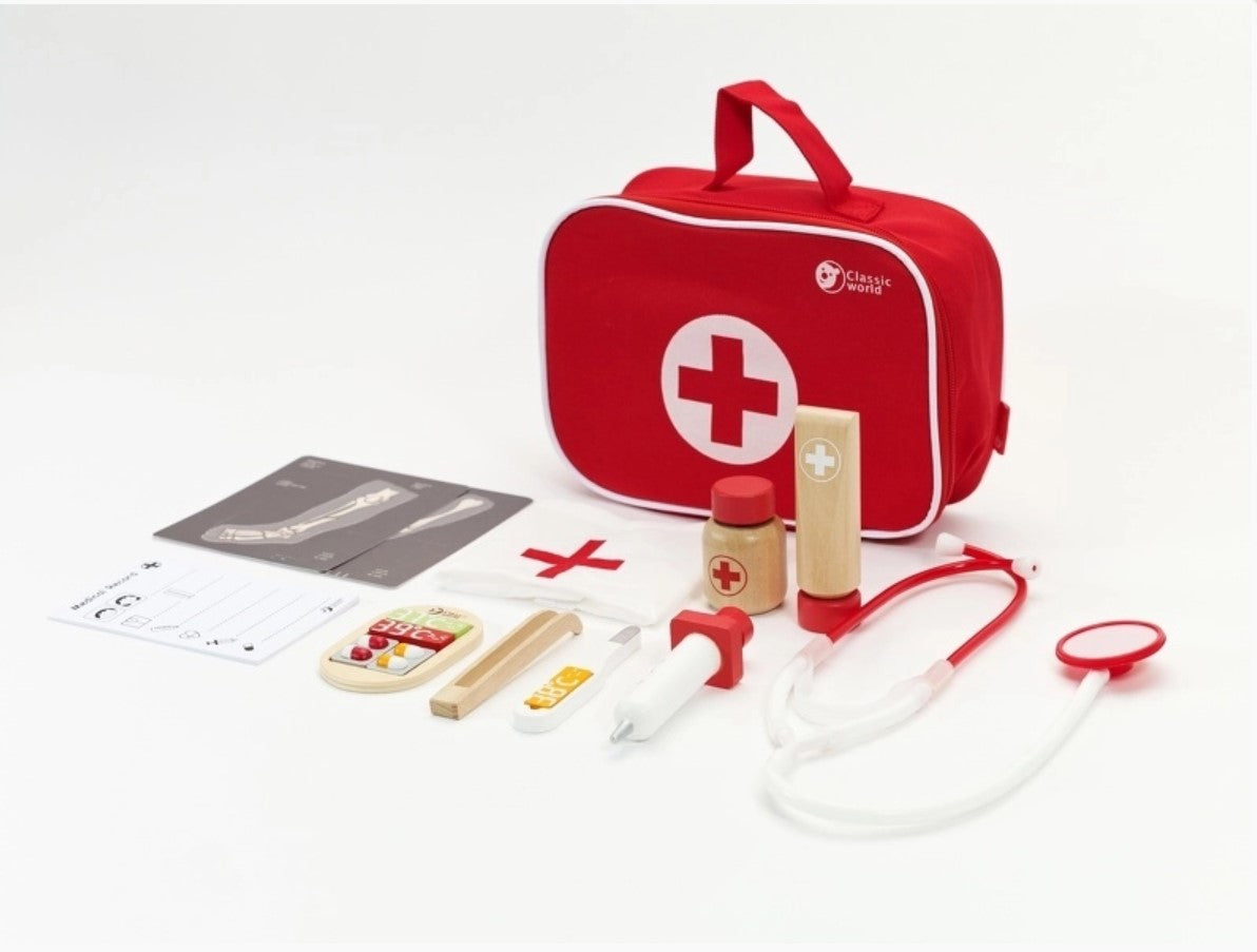 COMPLETE MEDICAL COLLECTION: Our pretend play doctor set comprises of a stethoscope, a medical bottle, an ointment, a syringe, a thermometer, temperature cards, 2 x-rays, pliers, capsules, a red cross armband, prescriptions, and a portable handbag
