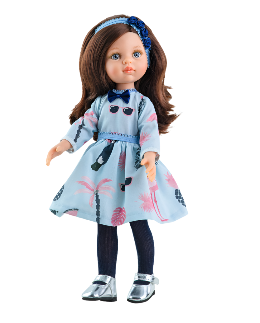 Carol is a 32 cm doll with grey eyes and wavy brown hair. She wears a more classic dress but made with a modern print and with a blue bow tie. And the silver-coloured shoes stand out so much in her grey eyes!