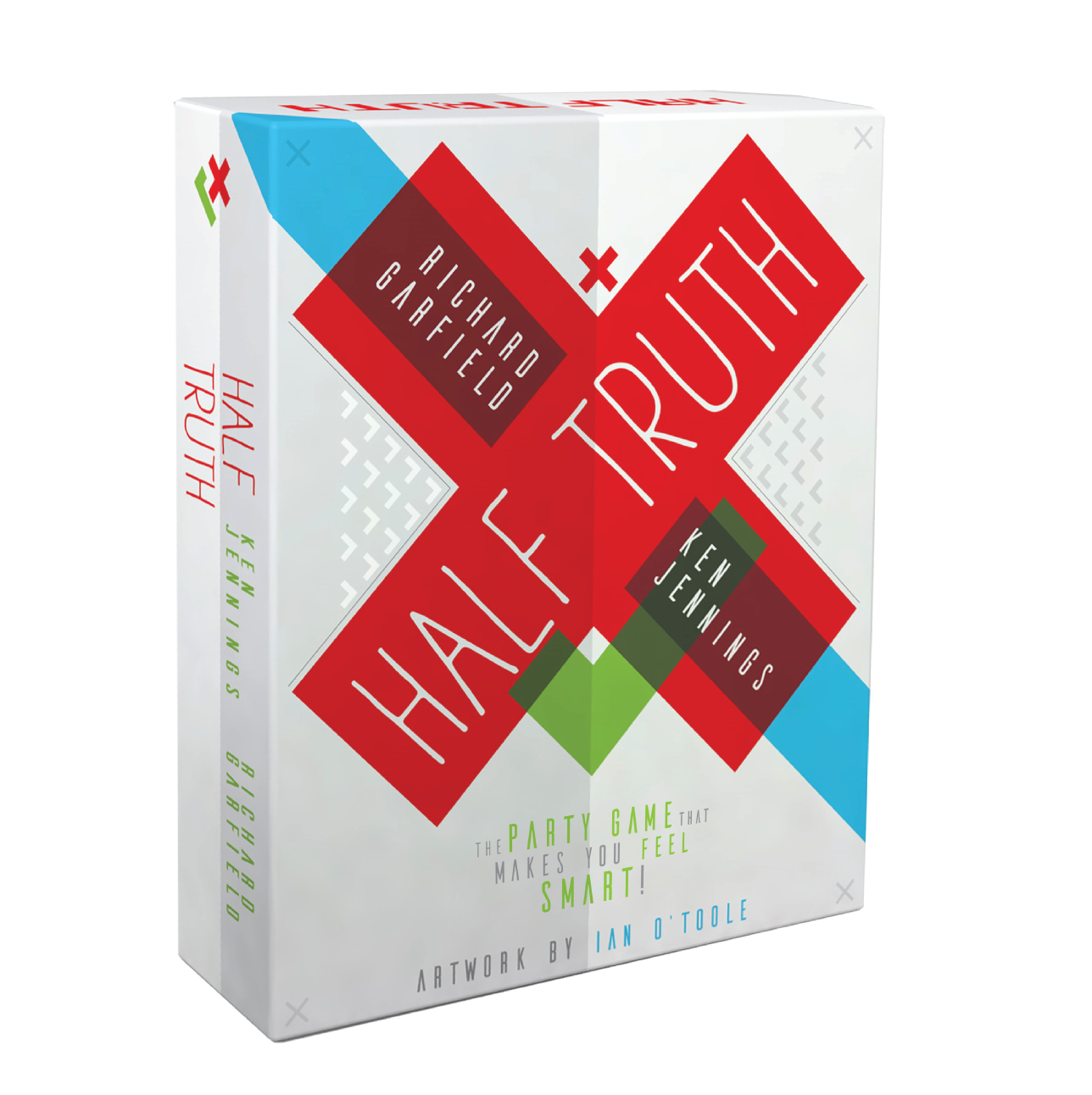 Half Truth is a party game for all ages and people, created by legendary game designer Richard Garfield and 74-time Jeopardy! winner Ken Jennings. With art by well-known artist Ian O'Toole, the game comes with 500 trivia question cards and each card has a category on it, like "Animals with blue tongues."