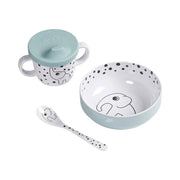 This cute Happy Dots First Meal Set with baby bowl, spoon and spout cup, is the ideal set for when you are introducing solids. The practical two-handled cup with a silicone spout lid is designed for practising first sips '“ the lid hugs tightly around the cup and can later be removed and used as an open cup.