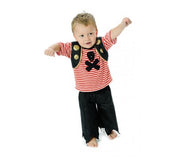Ahoy there!!! A great pirate outfit with a soft cotton t-shirt in red and white stripes. The t-shirt has the skull and x bones and a black vest attached. A pair of jagged pants make this outfit very piratey.