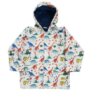 This dinosaur print is one of our customer favourites. T-rex, triceratops, and stegosaurus, in greens and yellows, run riot through vegetation and palm tress against a cream background. The coat’s green towelling lining compliments the print perfectly.