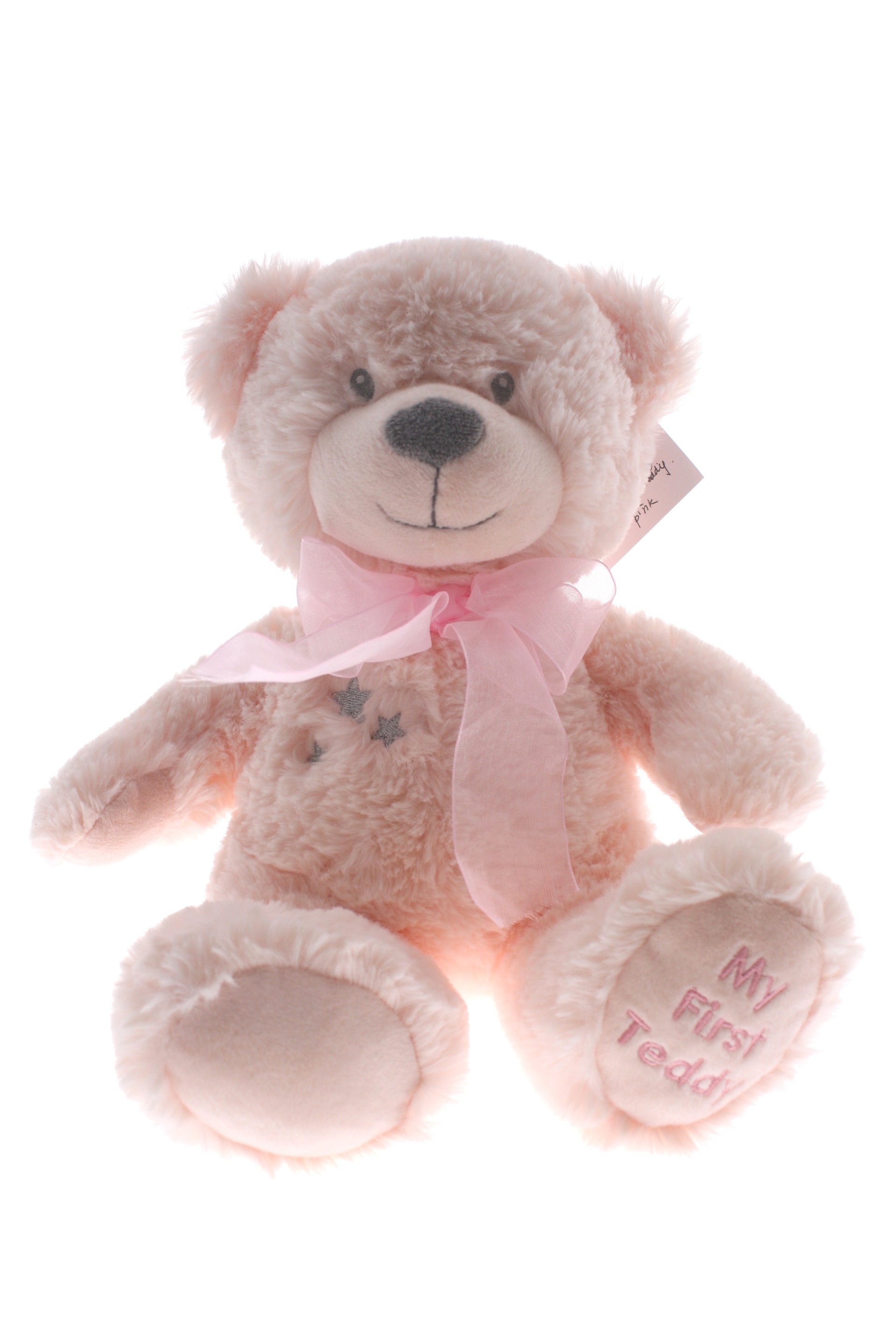 Crafted from the softest plush fabrics with baby-safe embroidery, this 25cm My First Teddy features the sweetest satin paws, an organza ribbon around their neck and an embroidered foot pad that reads 'My First Teddy'.