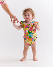 Say hello to all-day comfort and cuteness with our Follow The Sun Yellow Organic Short Sleeve Frill Romper! Made from the softest, snuggliest organic cotton jersey, these little wonders are designed for wriggling, rolling, snoozing, and everything in between. With short frilly sleeves for sunny-day ease, handy snaps for speedy changes, and a whole lot of Kip&Co colour and charm, they’re a must-have for mini movers and groovers. Whether it’s nap time, playtime or out-and-about time, this romper’s ready to roll! Featuring illustrated flowers in shades of pink, orange and cornflower blue with a few friendly bees and lady beetles on a sunshine yellow base.