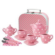 Neatly packed in a cute pink polka dotted cardboard travel case, it's easy to store and perfect for on the go play. Ideal for high tea pretend play, this set brings a touch of elegance to any imaginative gathering. Please note that this porcelain set should be used on soft surfaces, like carpet, to prevent breakage, and it is not designed to hold liquids. If any piece breaks, please dispose of it immediately for safety.
