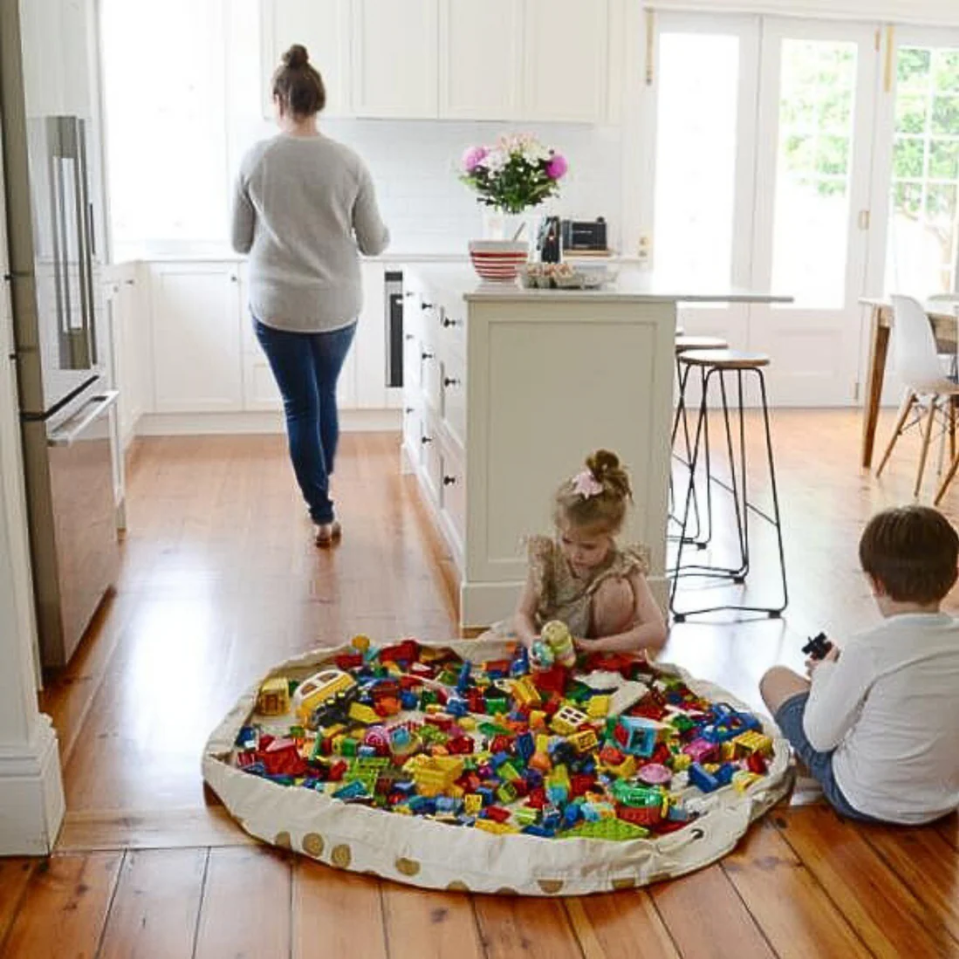 Spread the Play Pouch out for play and all the bits and pieces stay together. When it is time to pack away, just pull on the rope and in a jiffy you've gathered everything neatly into the Play Pouch.