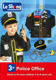 Set includes a police jacket with badge, cap, handcuffs & keys, walkie talkie, whistle.