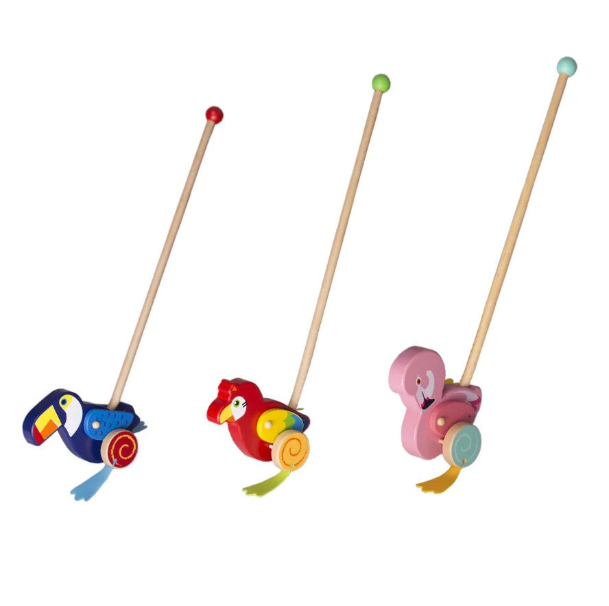 Beautiful bright push-along tropical birds by Kaper Kidz are made from quality wood. As the wheels roll the plastic feet flap against the floor.