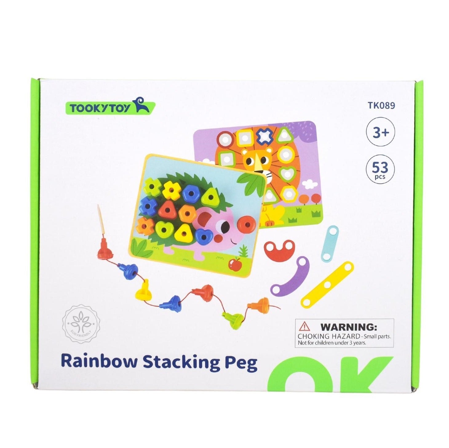 Stack, thread, match, sort and build with the Rainbow Stacking Pegs set. This set includes lots of fun peices to do different challenges and puzzles for young children. Put down a card and match the Peg to the picture below. You'll be matching colours and shapes to get the right combination. There are 8 cards to choose from with designs varying from animals, shapes and colours. Once completed, you can use the board to stack and build the pegs in free forms and however high you like. The set also comes with plastic linking platforms to make your stacking pegs stick together and to build higher and higher. For the last activity, this set also includes a wooden needle with thread to practice threading. Simply thread the needle through the middle of the pegs to practice and develop fine motor skills. This set has everything you need for fun educational, play based learning. With lots of different activtiies to do, this set will encourage and challenge young children with colourful, fun puzzles. Each Rainbow Stacking Peg set from Tooky Toys is made from timber, finished to the highest quality. It also features patterns on thick card and plastic pegs and spacers.