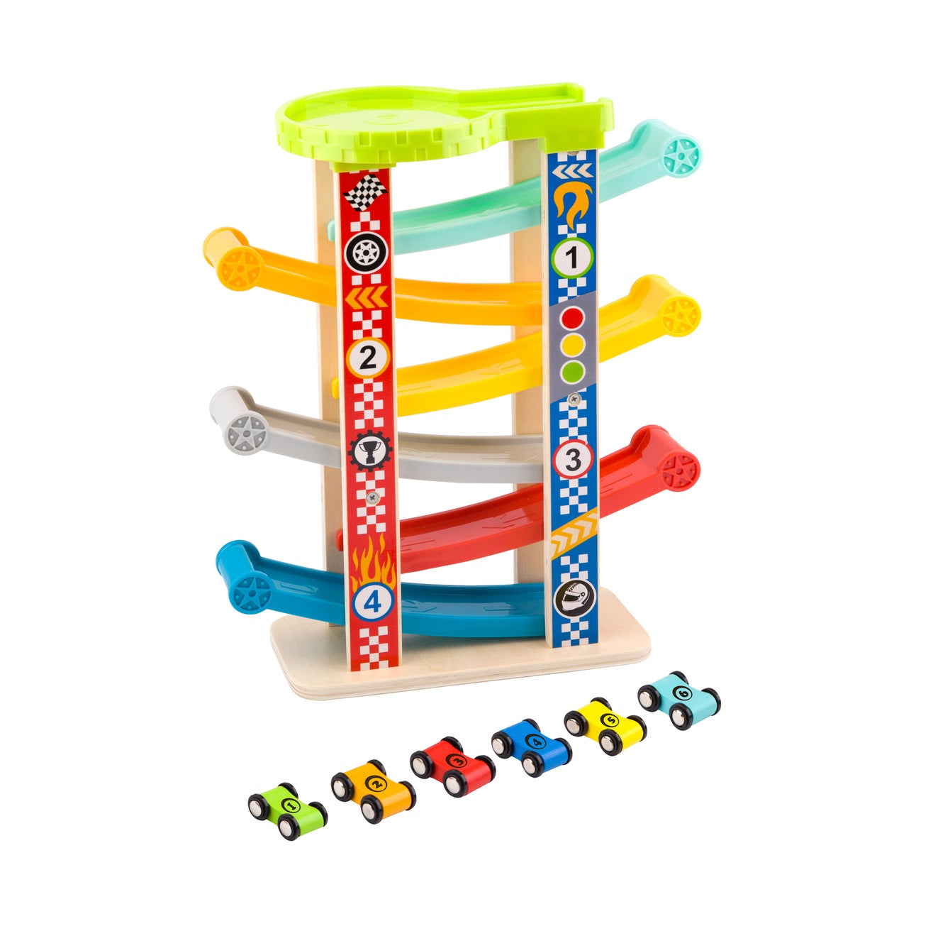 Introducing the Large Sliding Tower Car Run from Tooky Toy, a thrilling and engaging game that promises endless fun for children. This activity tower provides an opportunity for children to enhance their hand-eye coordination and fine motor skills while experiencing the excitement of racing cars.