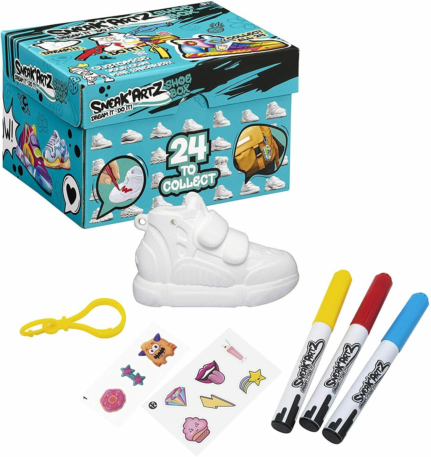 - 3 different boxes to choose from filled with a mini sneaker and assortment of 3 washable pens, sticker sheet and 3 charms.