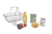 Chrome finish, old-school style, metal shopping basket. Comes complete with wooden grocery items to stimulate imaginative play. Great for the cubby house or budding chef as they roleplay life skills. Excellent addition to play kitchen. Finished with non-toxic paints.